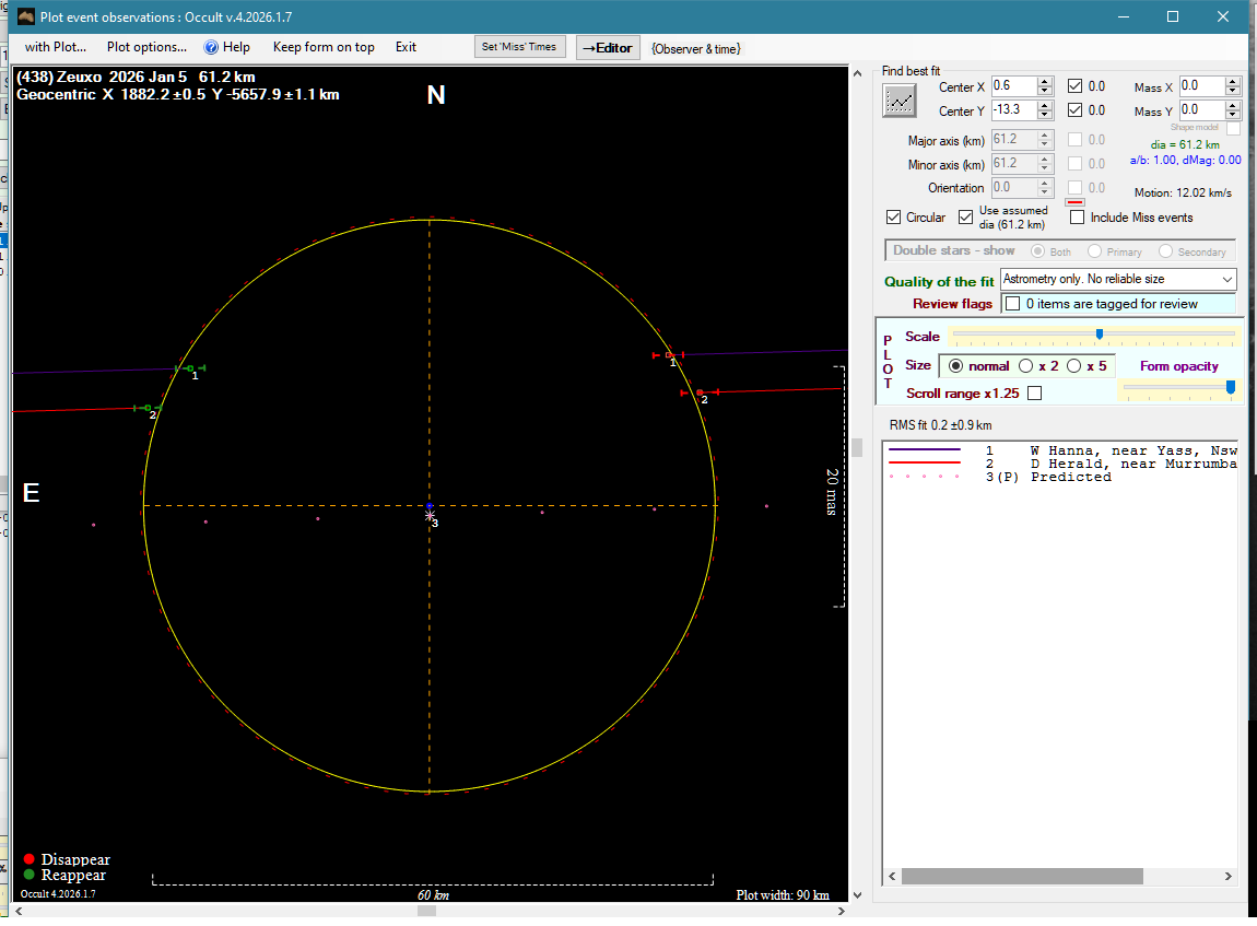 | 5-Jan-26 14:17 | (438) Zeuxo | UCAC4 607-023704 | W. Hanna D. Herald | Yass, NSW, AU Murrumbateman, NSW, AU | Positive Positive | ||