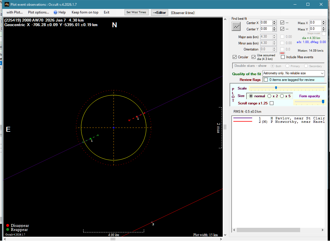 | 7-Jan-26 13:32 | (225419) 2000 AW70 | UCAC4 574-036910 | H. Pavlov P. Nosworthy | St Clair, NSW, AU Hazelbrook, NSW, AU | Positive Miss | ||