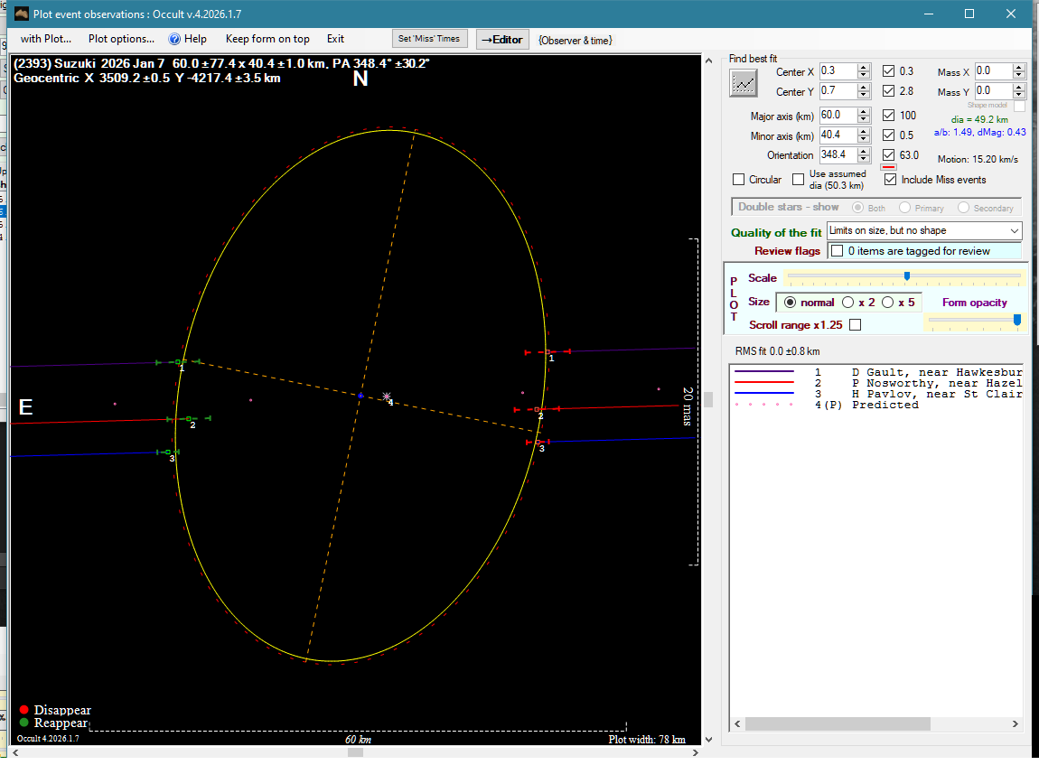 | 7-Jan-26 16:13 | (2393) Suzuki | UCAC4 506-028589 | H. Pavlov D. Gault P. Nosworthy | St Clair, NSW, AU Hawkesbury Heights, NSW, AU Hazelbrook, NSW, AU | Positive Positive Positive | ||