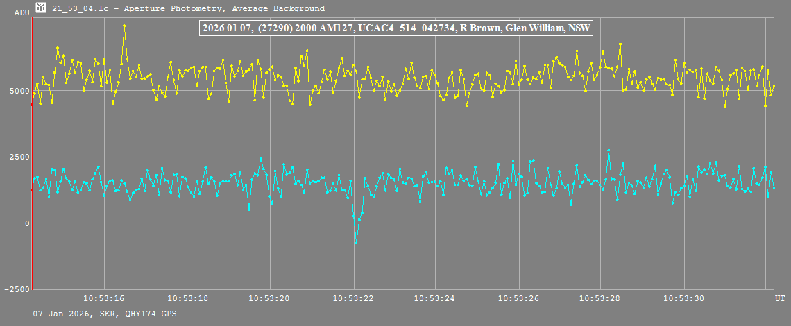 | 7-Jan-26 10:53 | (27290) 2000 AM127 | UCAC4 514-042734 | R. Brown | Glen William, NSW, AU | Positive | ||