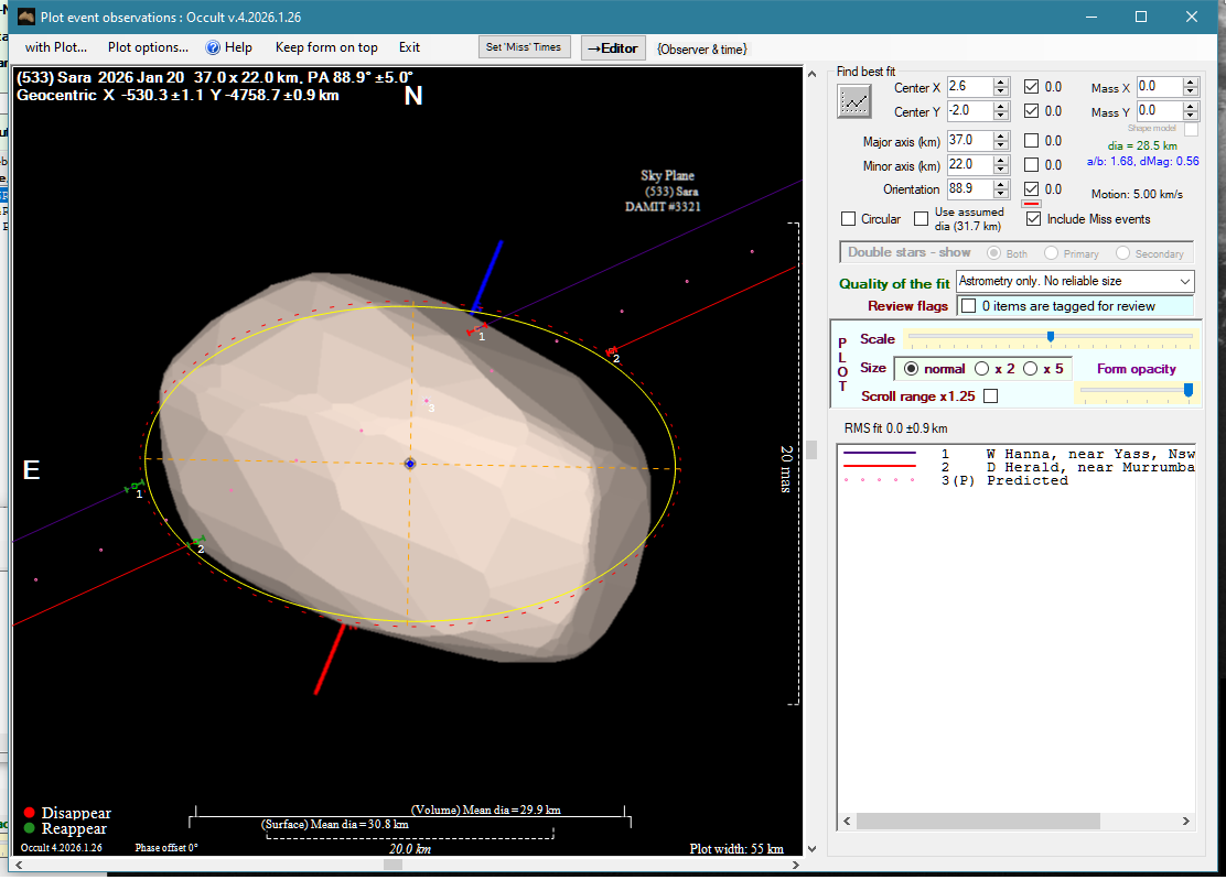 | 20-Jan-26 10:26 | (533) Sara | UCAC4 518-008780 | W. Hanna D. Herald | Yass, NSW, AU Murrumbateman, NSW, AU | Positive Positive | ||