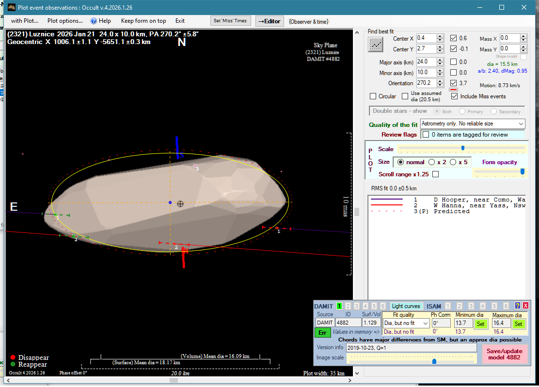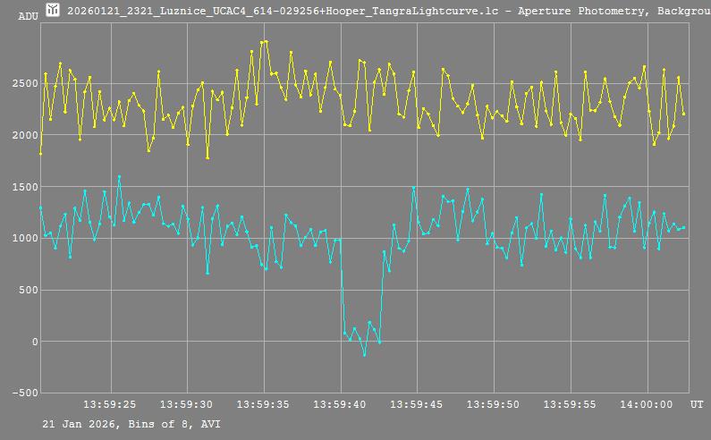 | 21-Jan-26 14:00 | (2321) Luznice | UCAC4 614-029256 | D. Hooper W. Hanna | Como, WA, AU Yass, NSW, AU | Positive Positive | ||