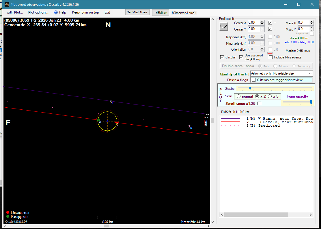 | 2-Apr-26 13:59 | (165673) 2001 OJ15 | UCAC4 193-110041 | D. Gault | Hawkesbury Heights, NSW, AU | Miss | ||