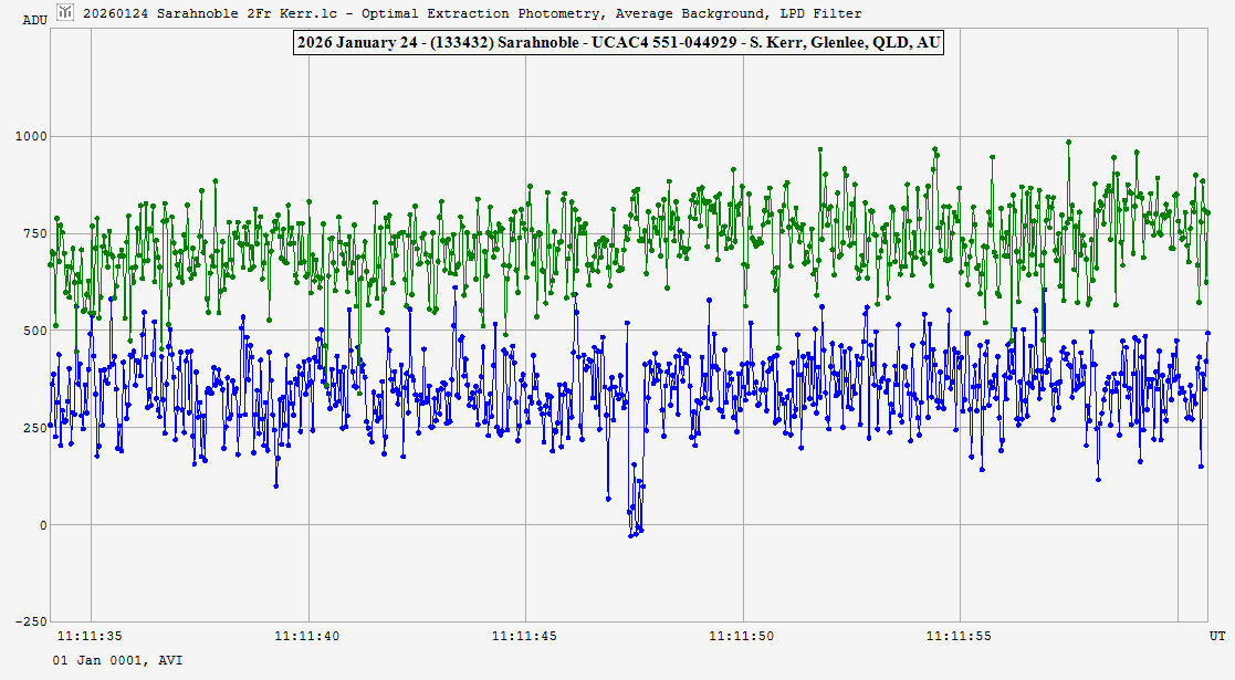 | 24-Jan-26 11:12 | (133432) Sarahnoble | UCAC4 551-044929 | S. Kerr | Glenlee, QLD, AU | Positive | ||