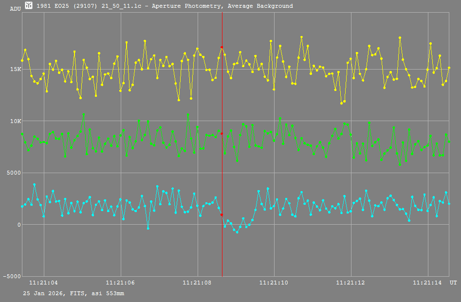 | 25-Jan-26 11:21 | (29107) 1981 EO25 | UCAC4 431-003261 | B. Lade | Blair Athol, SA, AU | Positive | ||