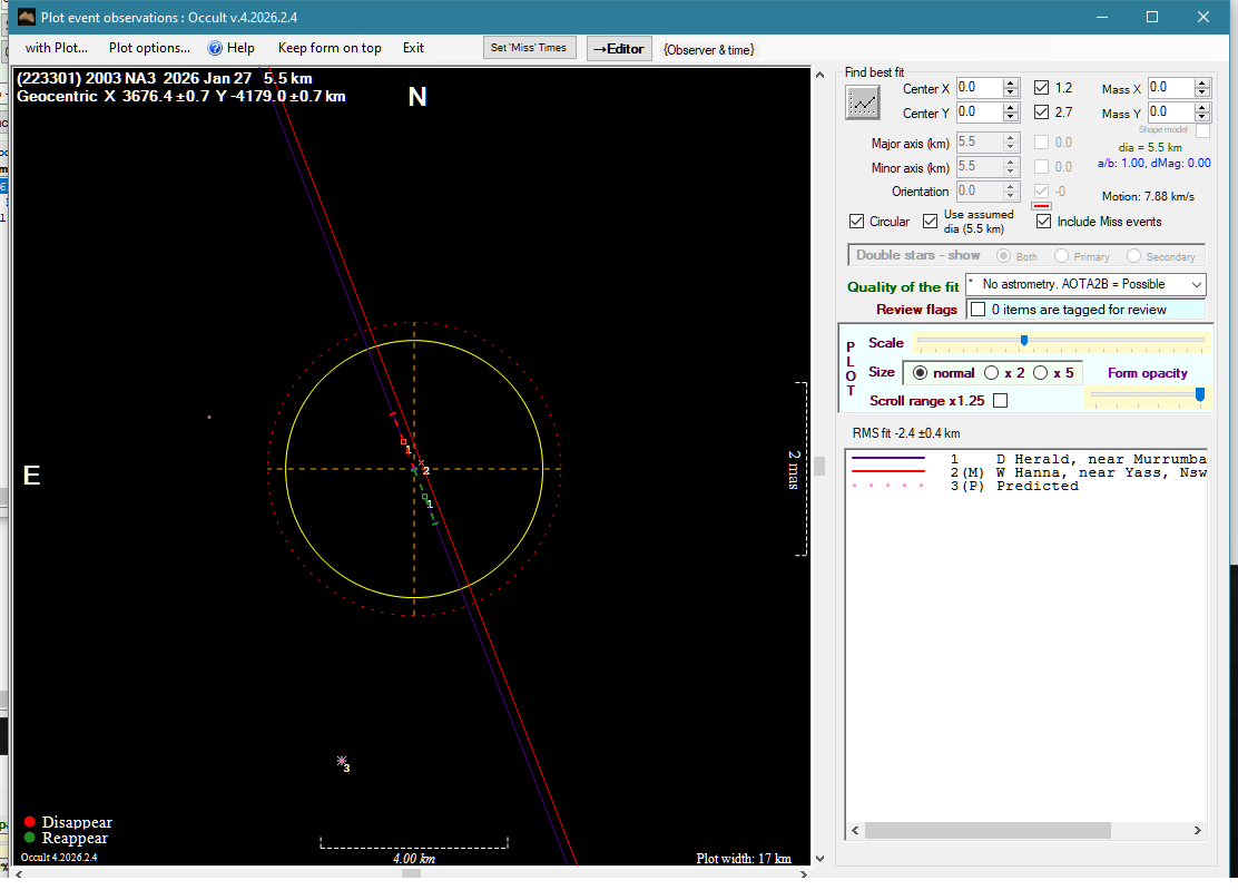 | 3-Jan-26 16:00 | (228174) 2009 SG233 | UCAC4 489-024339 | W. Hanna | Yass, NSW, AU | Miss | ||