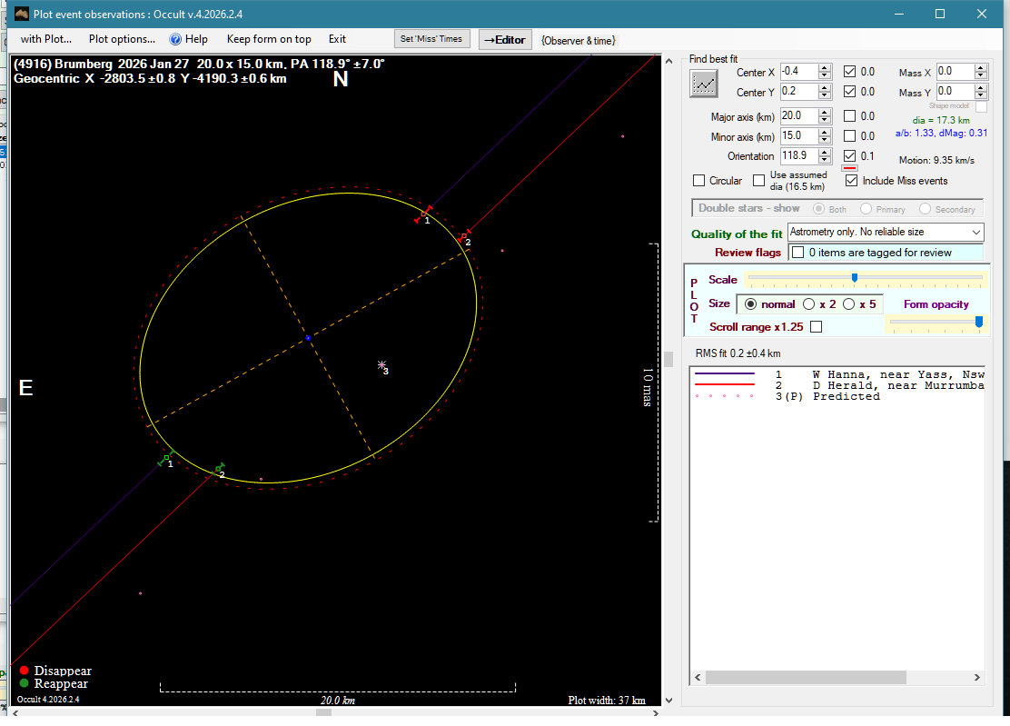 | 27-Jan-26 14:24 | (4916) Brumberg | UCAC4 490-054074 | W. Hanna D. Herald | Yass, NSW, AU Murrumbateman, NSW, AU | Positive Positive | ||