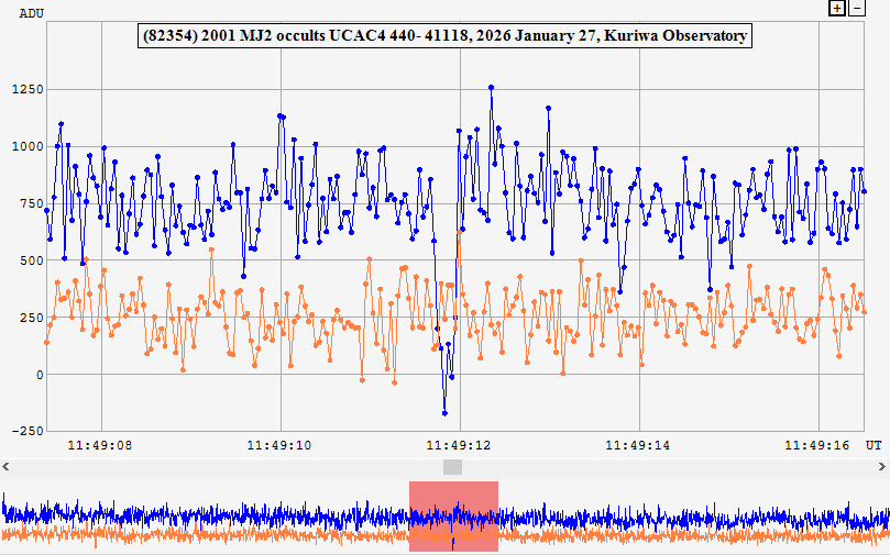 | 27-Jan-26 11:49 | (82354) 2001 MJ2 | UCAC4 440-041118 | D. Gault | Hawkesbury Heights, NSW, AU | Positive | ||