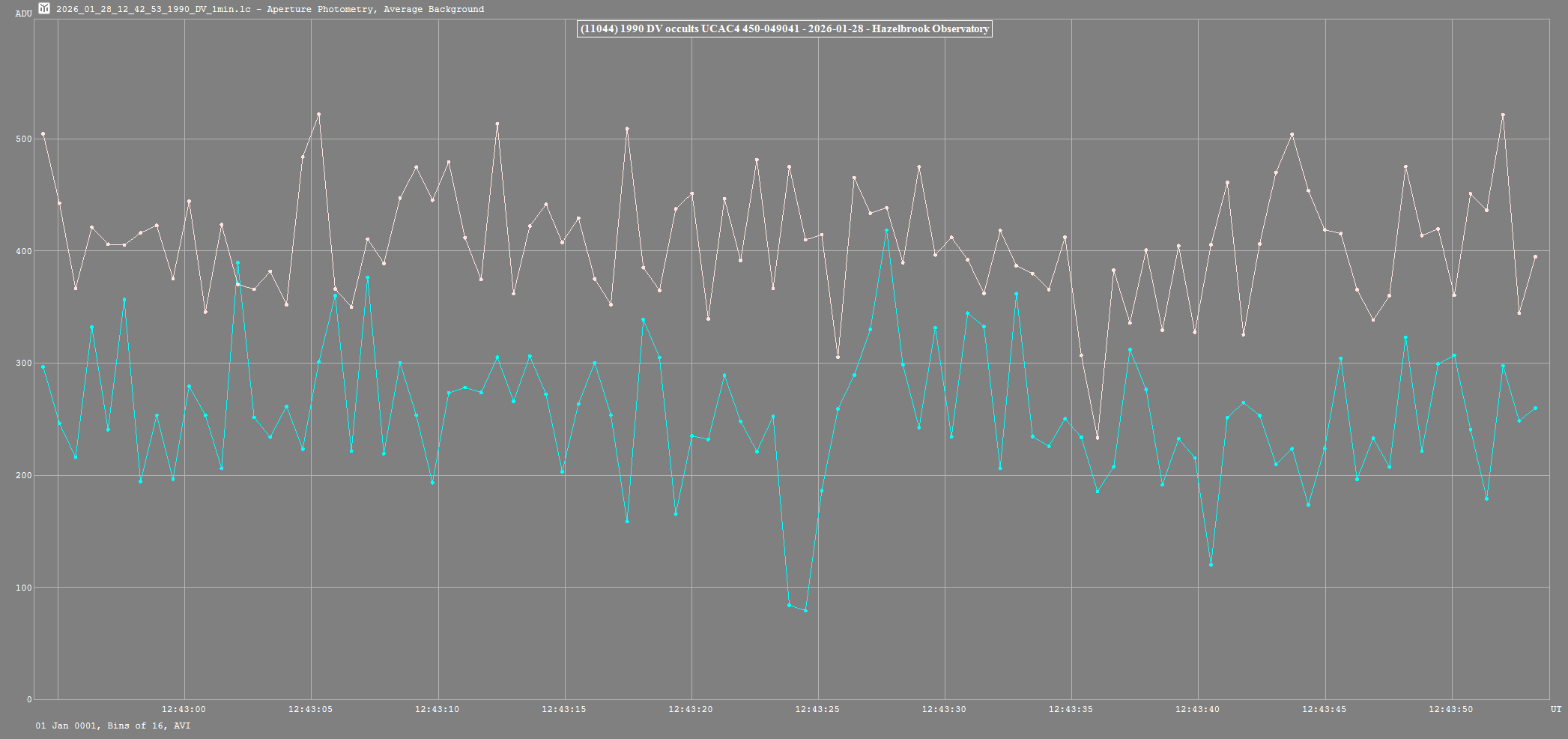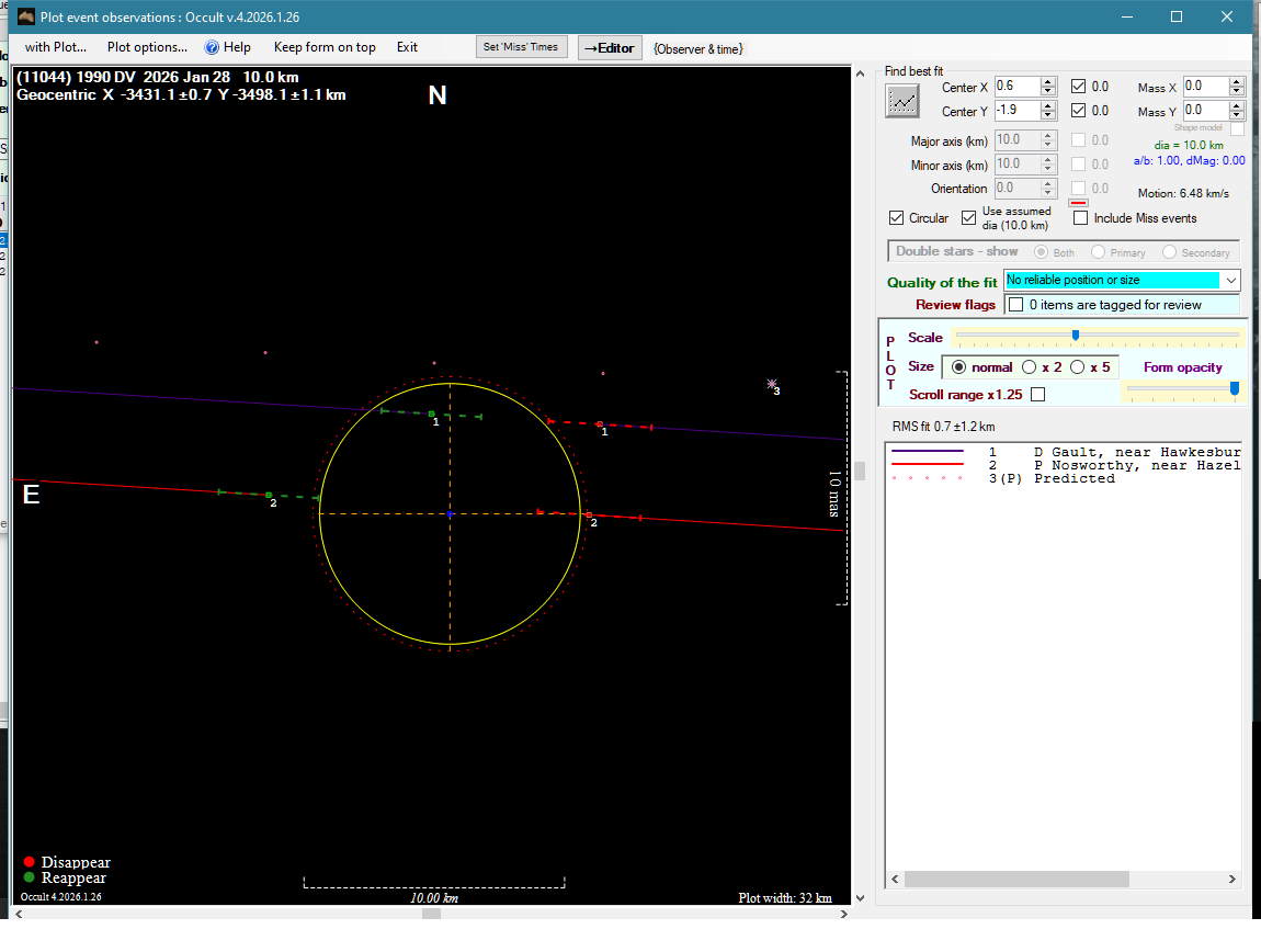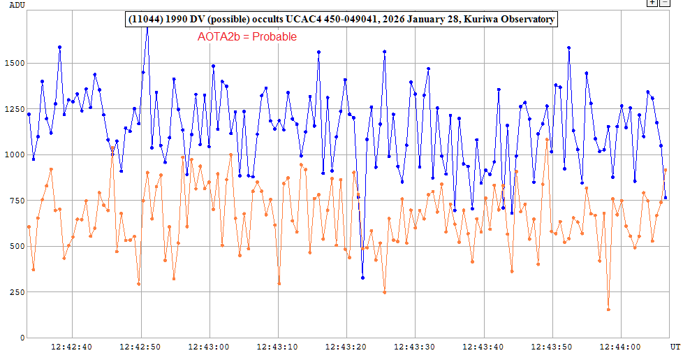 | 28-Jan-26 12:43 | (11044) 1990 DV | UCAC4 450-049041 | D. Gault P. Nosworthy | Hawkesbury Heights, NSW, AU Hazelbrook, NSW, AU | Positive Positive | ||