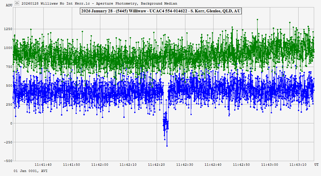 | 28-Jan-26 11:42 | (5445) Williwaw | UCAC4 554-014622 | S. Kerr | Glenlee, QLD, AU | Positive | ||