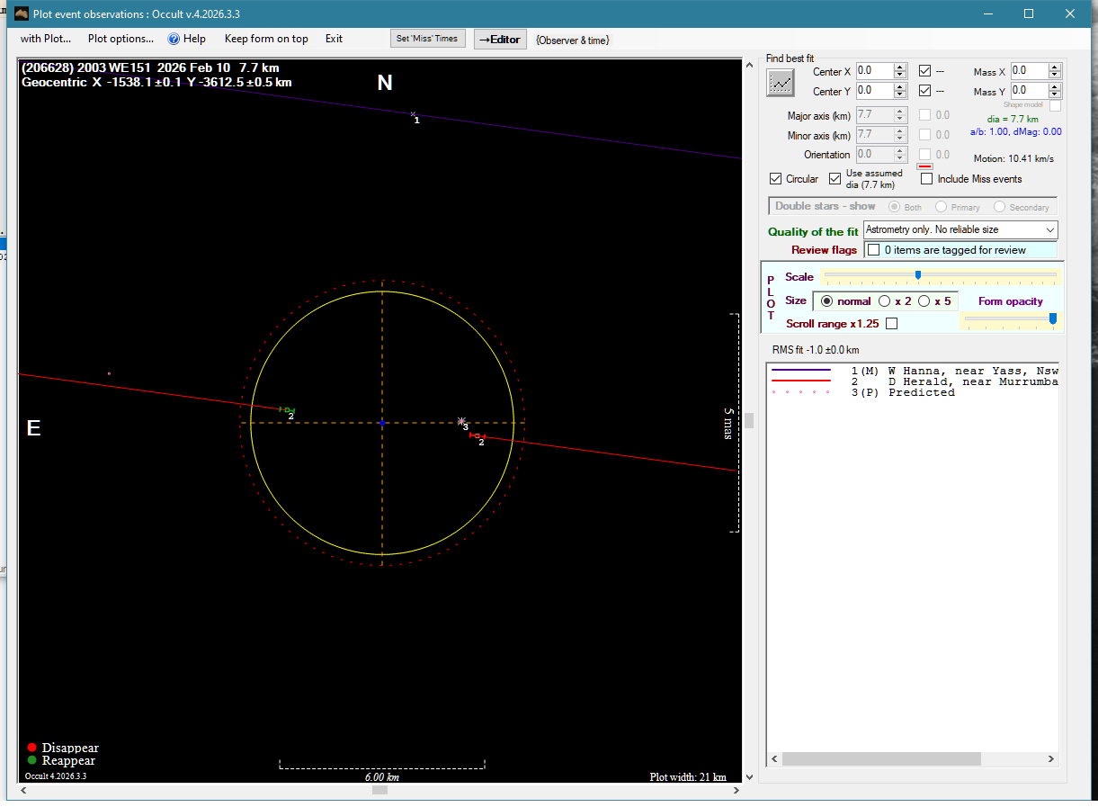 | 10-Feb-26 11:04 | (206628) 2003 WE151 | UCAC4 450-036229 | W. Hanna D. Herald | Yass, NSW, AU Murrumbateman, NSW, AU | Miss Positive | ||