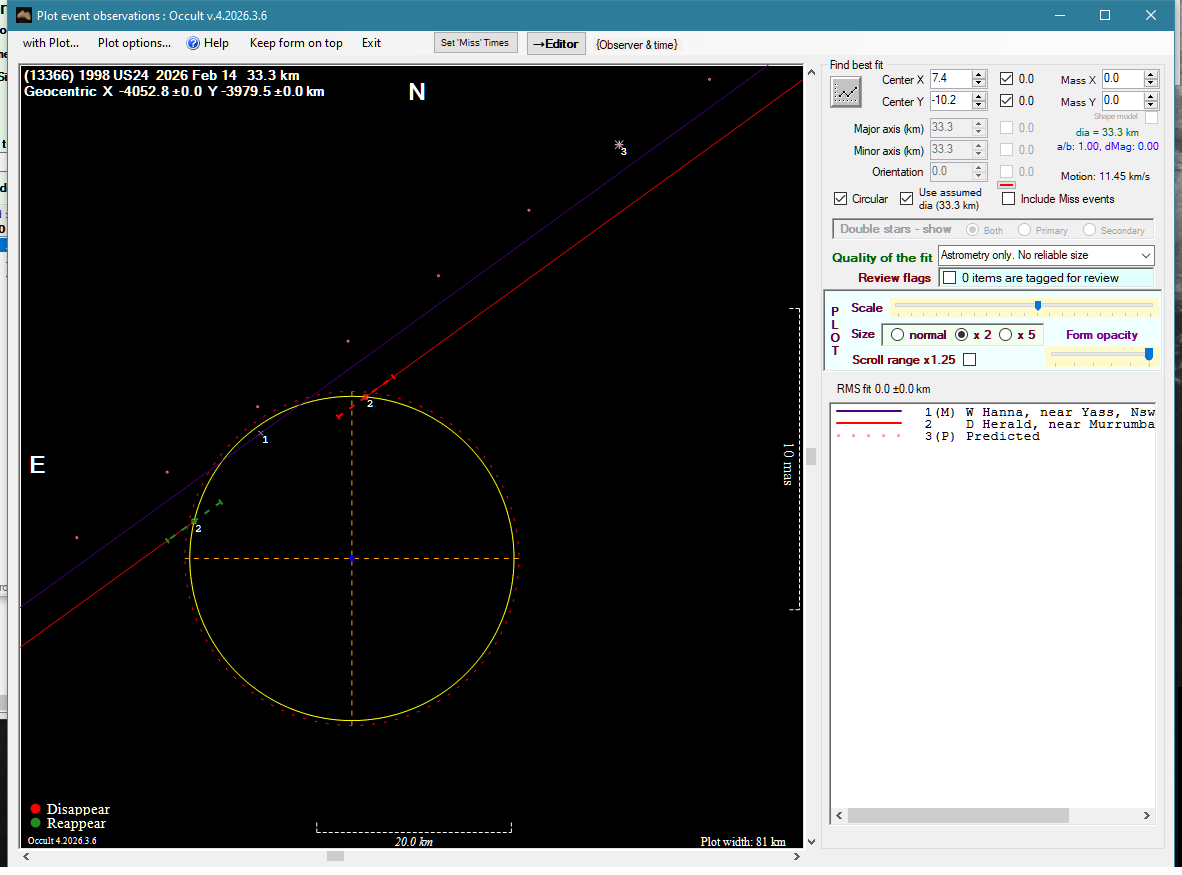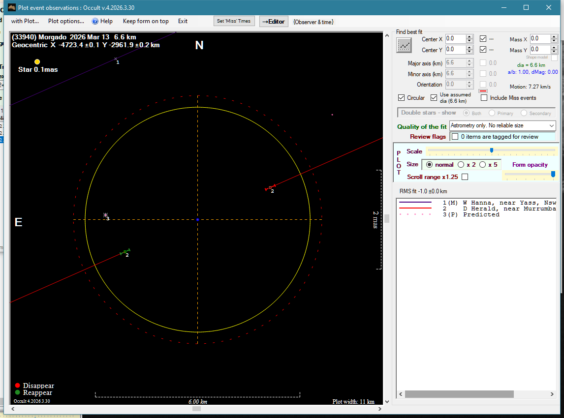 | 13-Mar-26 12:16 | (33940) Morgado | UCAC4 379-065657 | W. Hanna D. Herald | Yass, NSW, AU Murrumbateman, NSW, AU | Miss Positive | ||