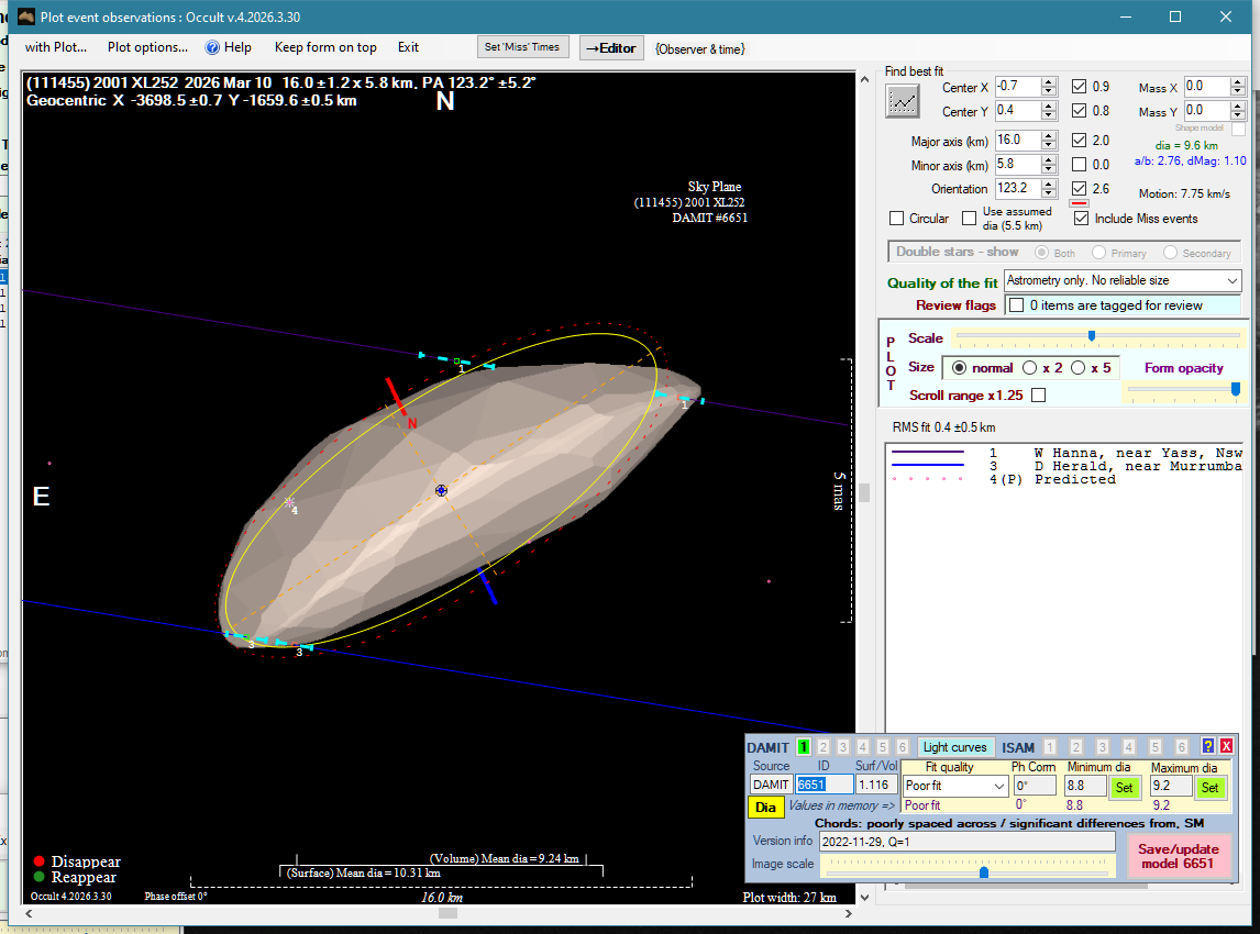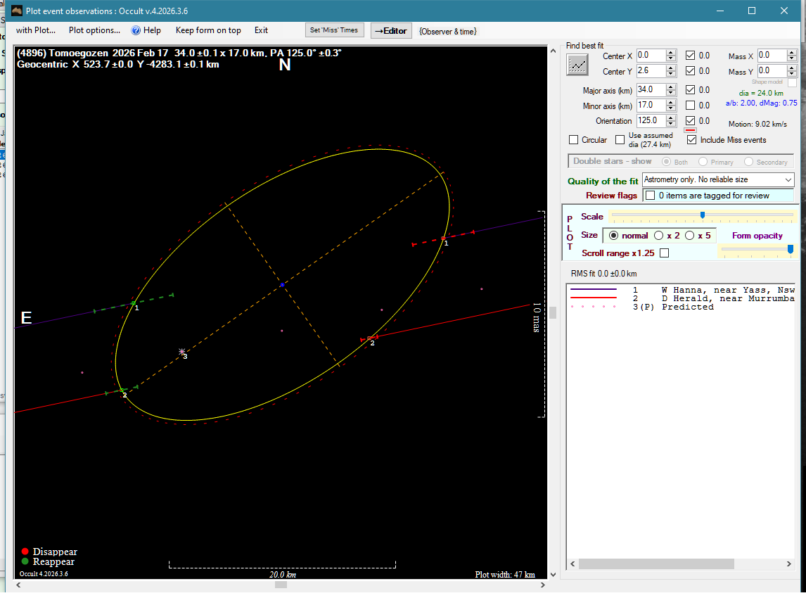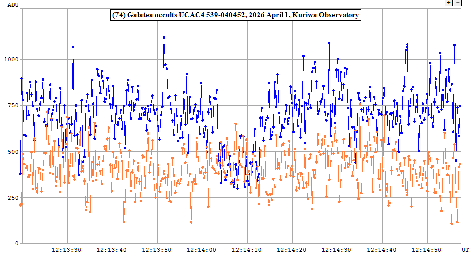 | 1-Apr-26 12:14 | (74) Galatea | UCAC4 539-040452 | H. Pavlov D. Gault P. Nosworthy | St Clair, NSW, AU Hawkesbury Heights, NSW, AU Hazelbrook, NSW, AU | Positive Positive Positive | ||