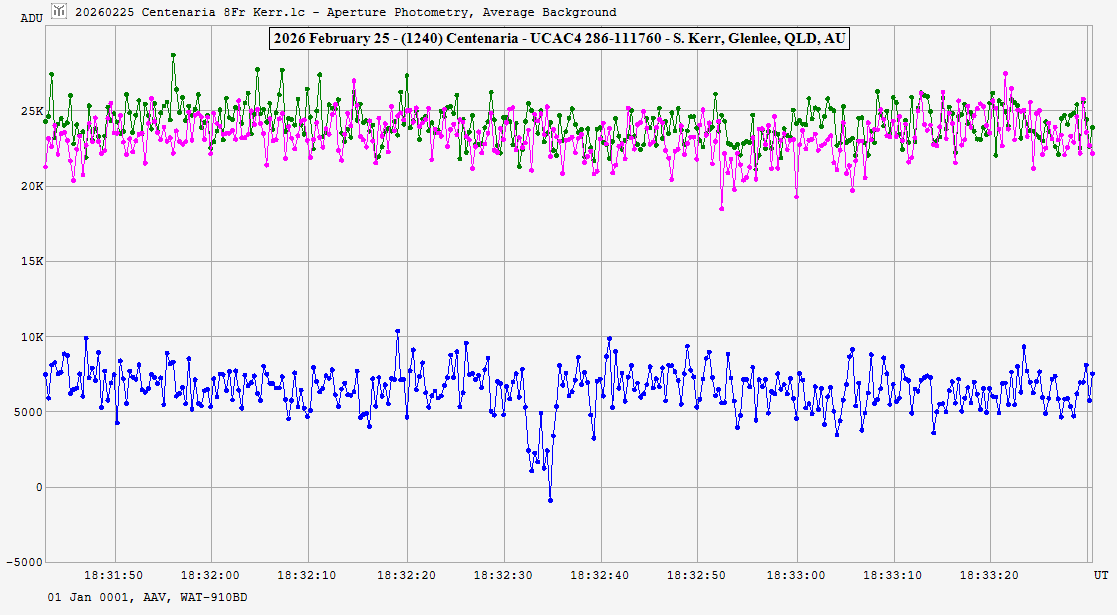 | 25-Feb-26 18:33 | (1240) Centenaria | UCAC4 286-111760 | S. Kerr | Glenlee, QLD, AU | Positive | ||