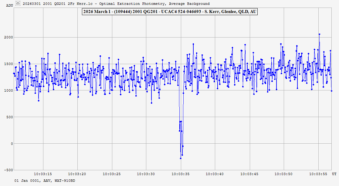 | 1-Mar-26 10:04 | (109444) 2001 QG201 | UCAC4 524-046693 | S. Kerr | Glenlee, QLD, AU | Positive | ||