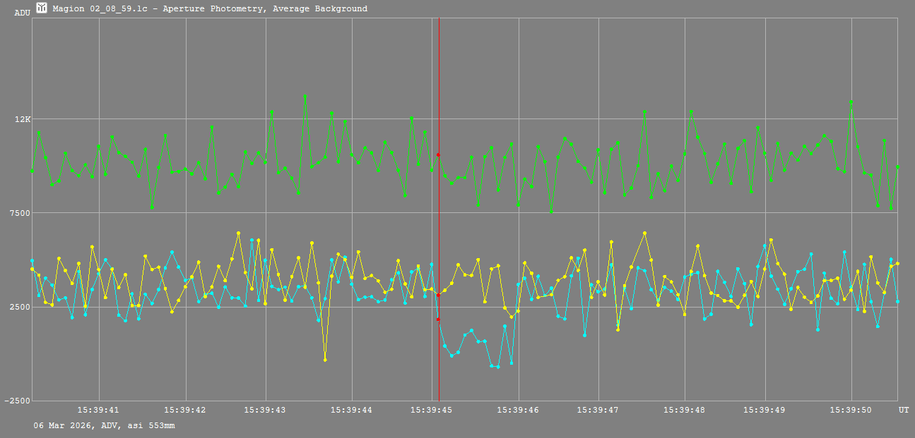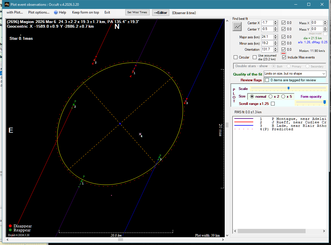 | 6-Mar-26 15:40 | (2696) Magion | UCAC4 411-055067 | P. Montague J. Rueff B. Lade | Adelaide, SA, AU Cudlee Creek, SA, AU Blair Athol, SA, AU | Positive Positive Positive | ||