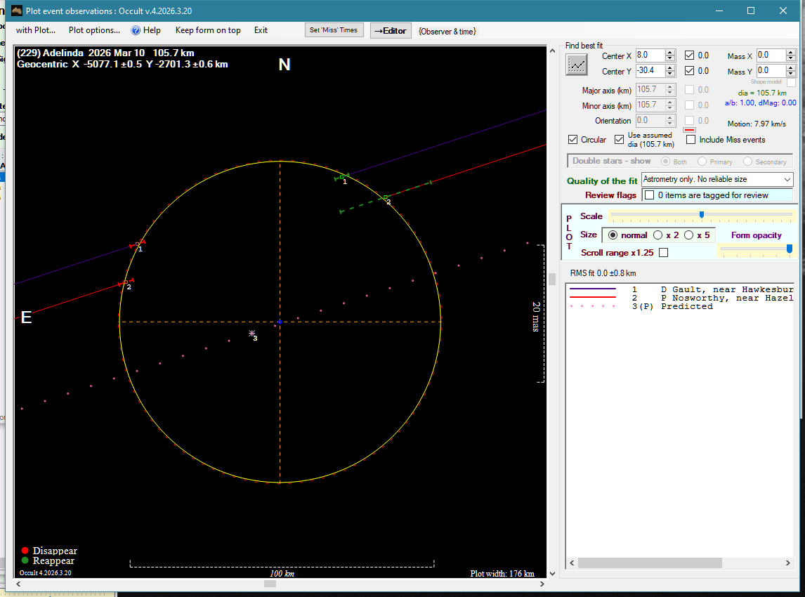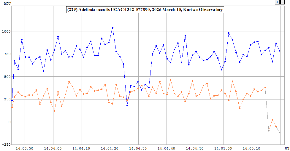 | 10-Mar-26 14:09 | (229) Adelinda | UCAC4 342-077890 | D. Gault P. Nosworthy | Hawkesbury Heights, NSW, AU Hazelbrook, NSW, AU | Positive Positive | ||