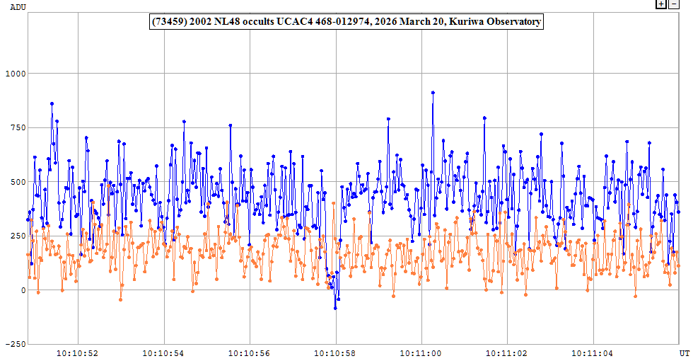 | 20-Mar-26 10:11 | (73459) 2002 NL48 | UCAC4 468-012974 | D. Gault | Hawkesbury Heights, NSW, AU | Positive | ||