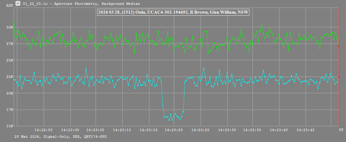 | 28-Mar-26 14:23 | (15102) Oulu | UCAC4 302-194692 | R. Brown | Glen William, NSW, AU | Positive | ||