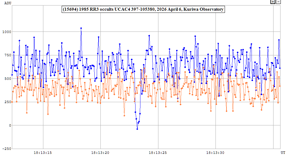 | 6-Apr-26 18:13 | (15694) 1985 RR3 | UCAC4 397-105380 | D. Gault | Hawkesbury Heights, NSW, AU | Positive | ||