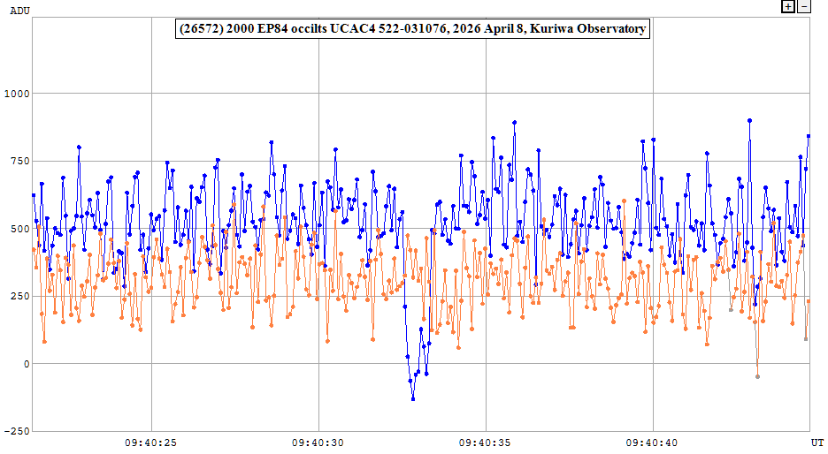 | 8-Apr-26 9:41 | (26572) 2000 EP84 | UCAC4 522-031076 | D. Gault | Hawkesbury Heights, NSW, AU | Positive | ||