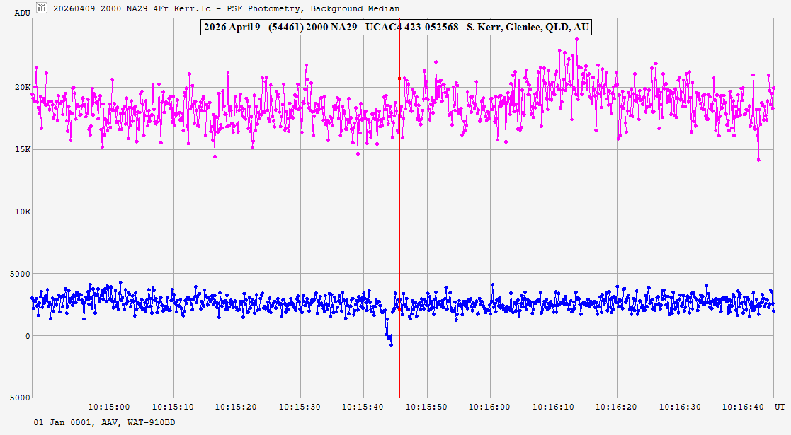 | 9-Apr-26 10:16 | (54461) 2000 NA29 | UCAC4 423-052568 | S. Kerr | Glenlee, QLD, AU | Positive | ||