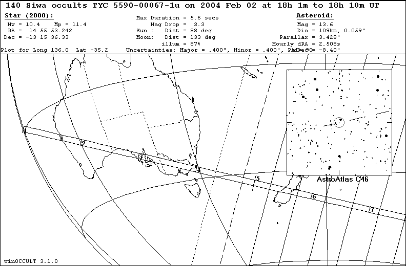 On 2004 Feb 02 UT, the 109 km diameter asteroid (140) Siwa will occult a 10.4 mag star in the constellation Libra for observers along a path across S Australia.