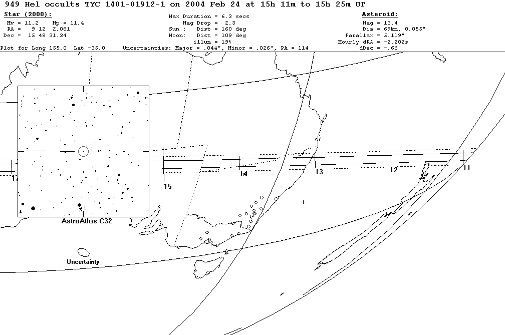 On 2004 Feb 24 UT, the 69 km diameter asteroid (949) Hel will occult a 11.2 mag star in the constellation Cancer for observers along a path across New Zealand, Australia.