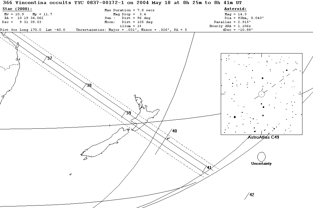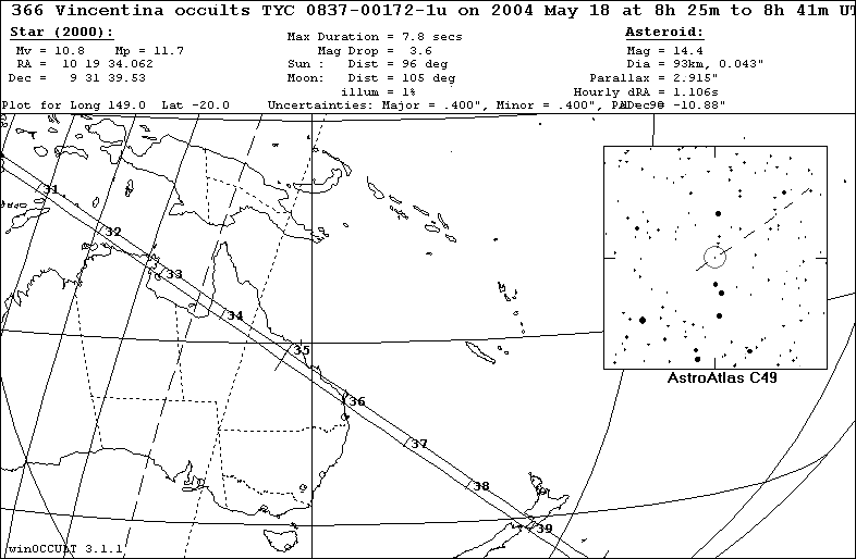 On 2004 May 18 UT, the 93 km diameter asteroid (366) Vincentina will occult a 10.9 mag star in the constellation Leo for observers along a path across NE Australia, New Zealand.