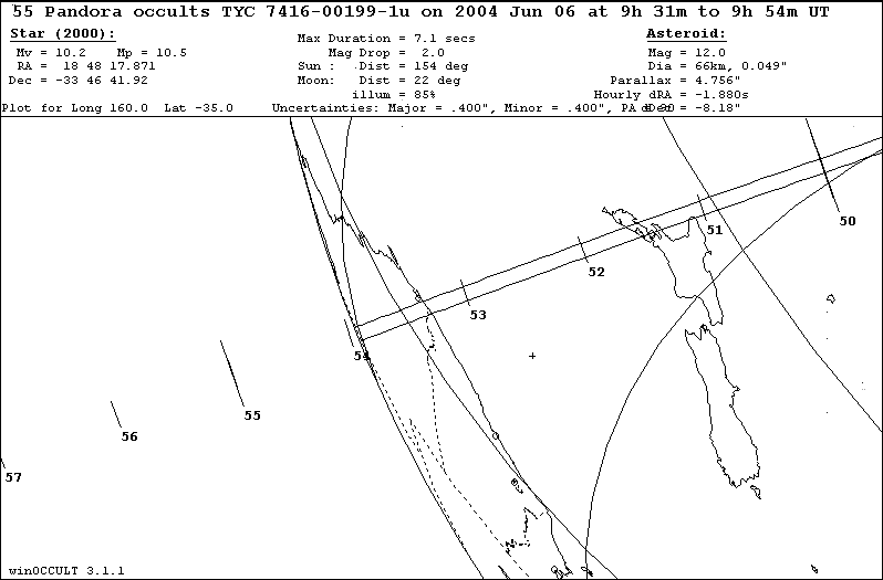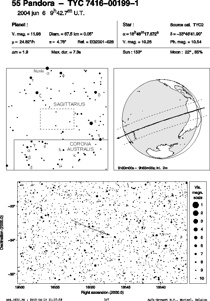 On 2004 Jun 06 UT, the 66 km diameter asteroid (55) Pandora will occult a 10.3 mag star in the constellation Sagittarius for observers along a path across Brazil, Peru, New Zealand, Australia.