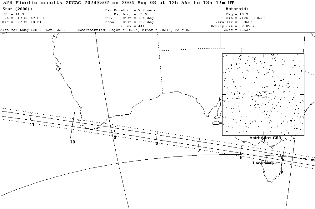 On 2004 Aug 08 UT, the 71 km diameter asteroid (524) Fidelio will occult a 11.3 mag star in the constellation Sagittarius for observers along a path across New Zealand, Australia.