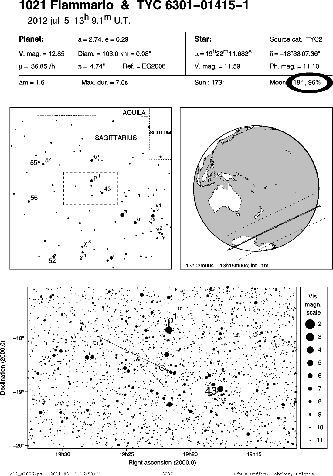 On 2012 Jul 05 UT, the 97 km diameter asteroid (1021) Flammario will occult a 11.3 mag star in the constellation Sagittarius for observers along a path across New Guinea, northern and north-western Australia.