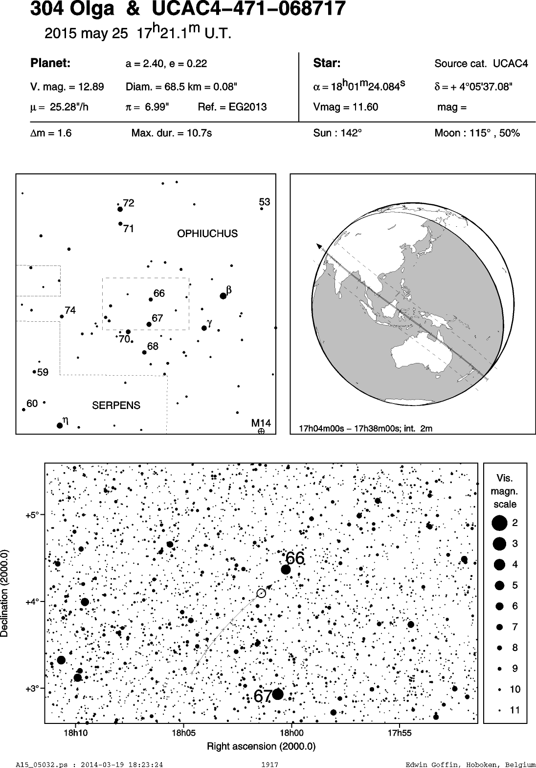 On 2015 May 25 UT, the 71 km diameter asteroid (304) Olga will occult a 11.6 mag star in the constellation Ophiuchus for observers along a path firstly passing over New Zealand, passing near Wellington and Blenheim. Then in Australia the path passes near Grafton, Longreach and Katherine in Northern Territory.